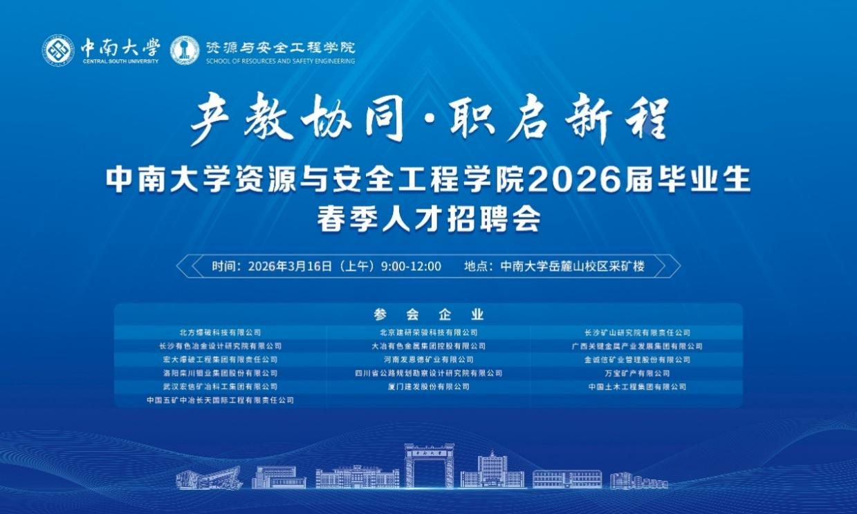 在采矿楼举行2026届春季人才招聘会暨校企合作人才培养座谈会。活动邀请宏大爆破工程集团有限责任公司、金诚信矿业管理股份有限公司、中国五矿中冶长天国际工程有限责任公司、北方爆破科技有限公司等16家用人单位现场提供近400个就业岗位。